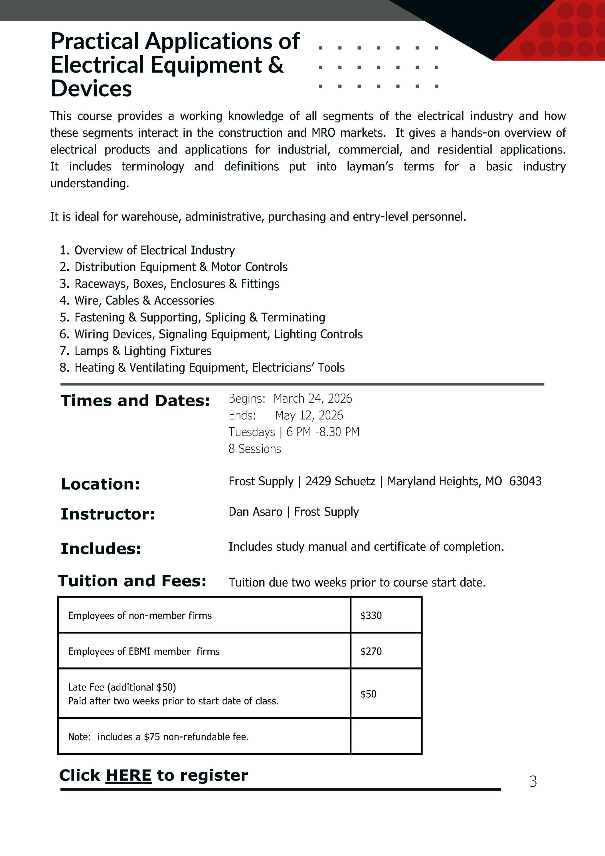This course provides a working knowledge of all segments of the electrical industry and how these segments interact in the construction and MRO markets. It gives a hands-on overview of electrical products and applications for industrial, commercial, and residential applications. It includes terminology and definitions put into layman’s terms for a basic industry understanding. It is ideal for warehouse, administrative, purchasing and entry-level personnel. 1. Overview of Electrical Industry 2. Distribution Equipment & Motor Controls 3. Raceways, Boxes, Enclosures & Fittings 4. Wire, Cables & Accessories 5. Fastening & Supporting, Splicing & Terminating 6. Wiring Devices, Signaling Equipment, Lighting Controls7. Lamps & Lighting Fixtures 8. Heating & Ventilating Equipment, Electricians’ Tools