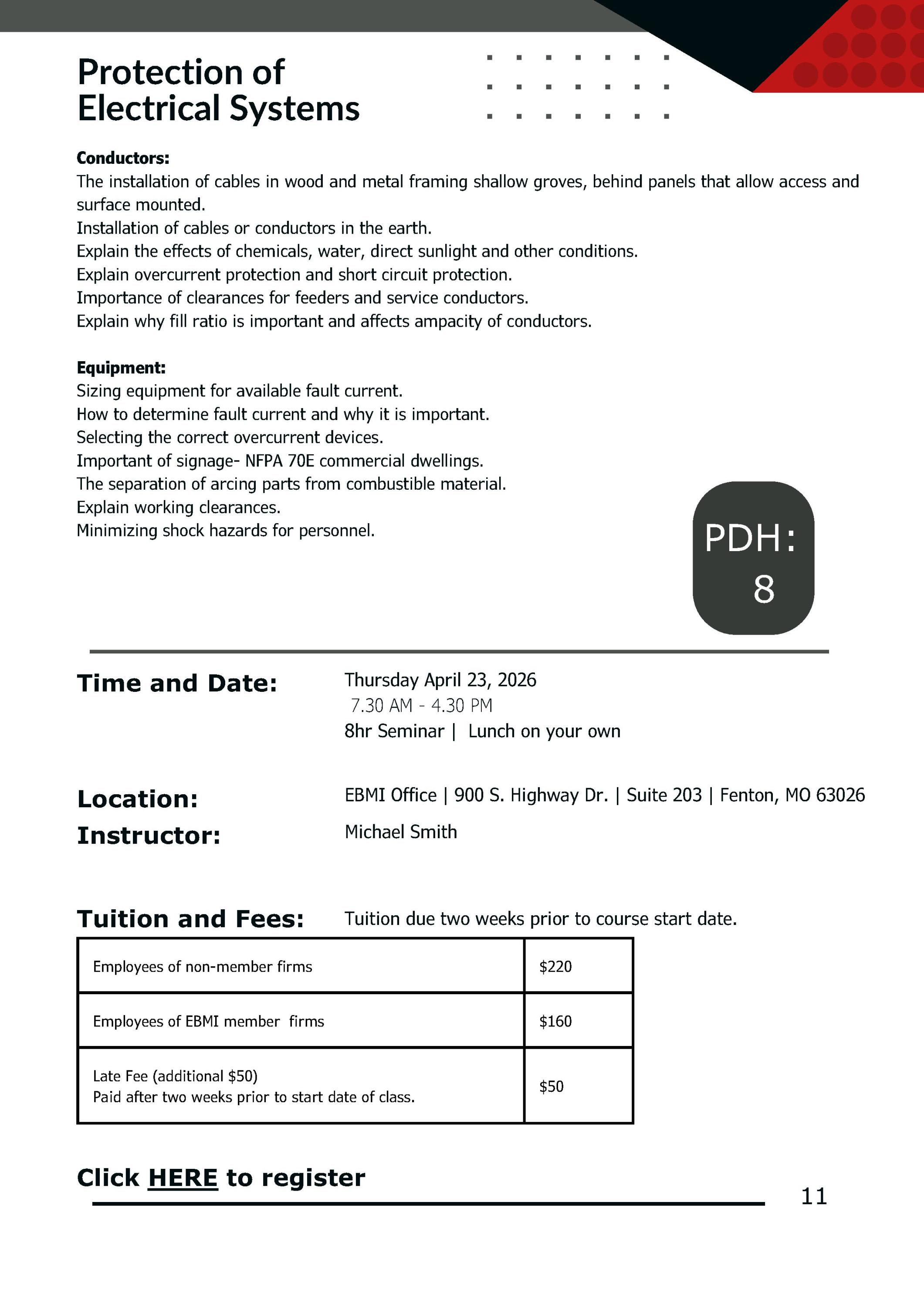 Conductors: The installation of cables in wood and metal framing shallow groves, behind panels that allow access and surface mounted. Installation of cables or conductors in the earth.Explain the effects of chemicals, water, direct sunlight and other conditions. Explain overcurrent protection and short circuit protection. Importance of clearances for feeders and service conductors. Explain why fill ratio is important and affects ampacity of conductors. Equipment: Sizing equipment for available fault current.How to determine fault current and why it is important.Selecting the correct overcurrent devices. Important of signage- NFPA 70E commercial dwellings.The separation of arcing parts from combustible material.Explain working clearances. Minimizing shock hazards for personnel.