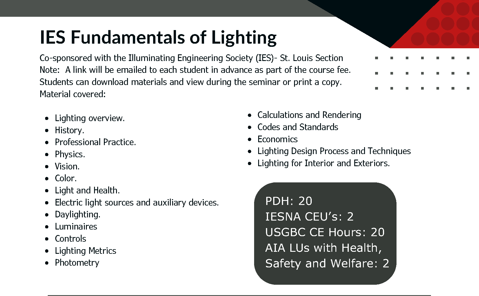 This course is approved for 20 PDH; 2 IESNA CEUs; 20 USGBC CEs and 2 AIA LUs with Health, Safety and Welfare (HSW) credit.